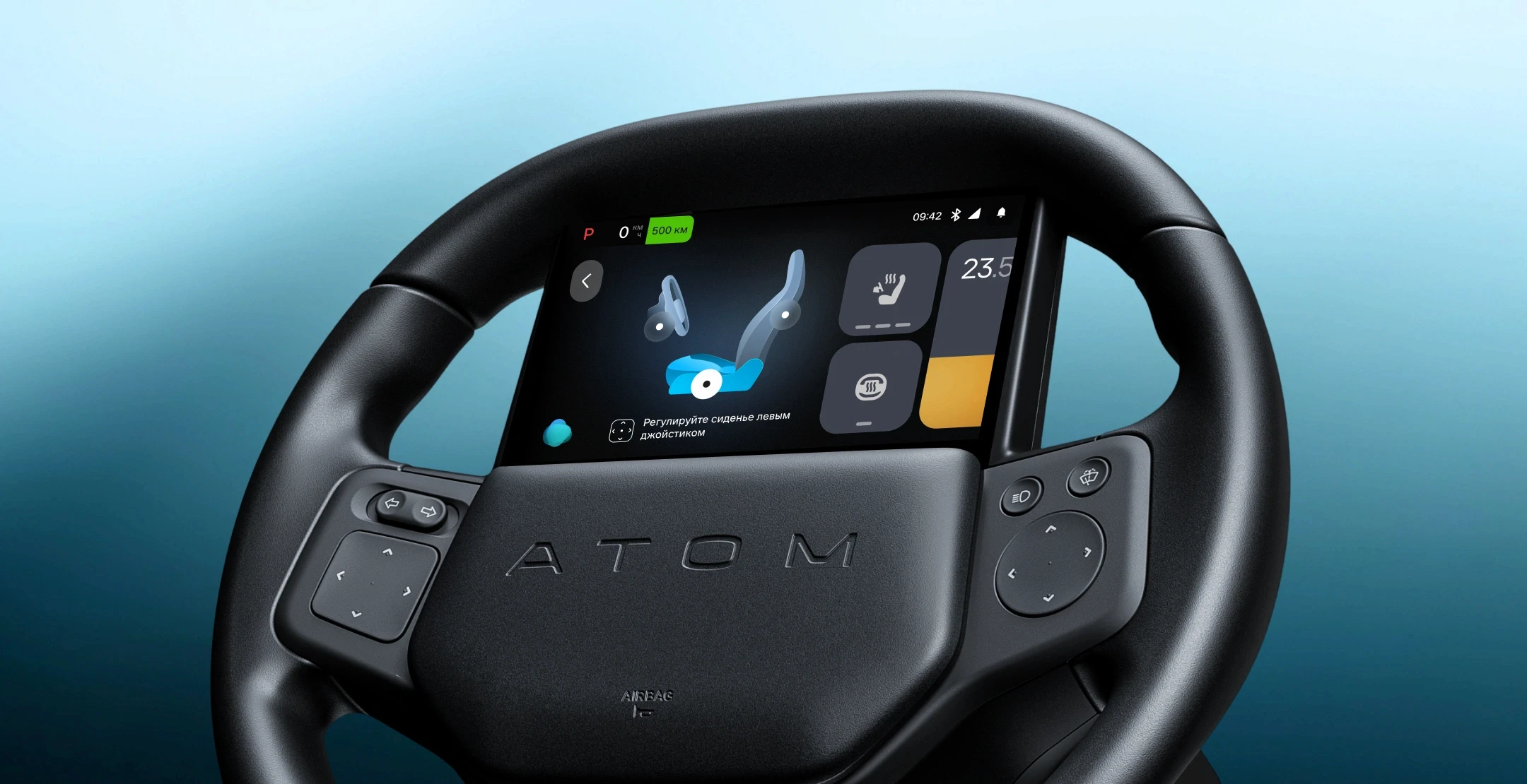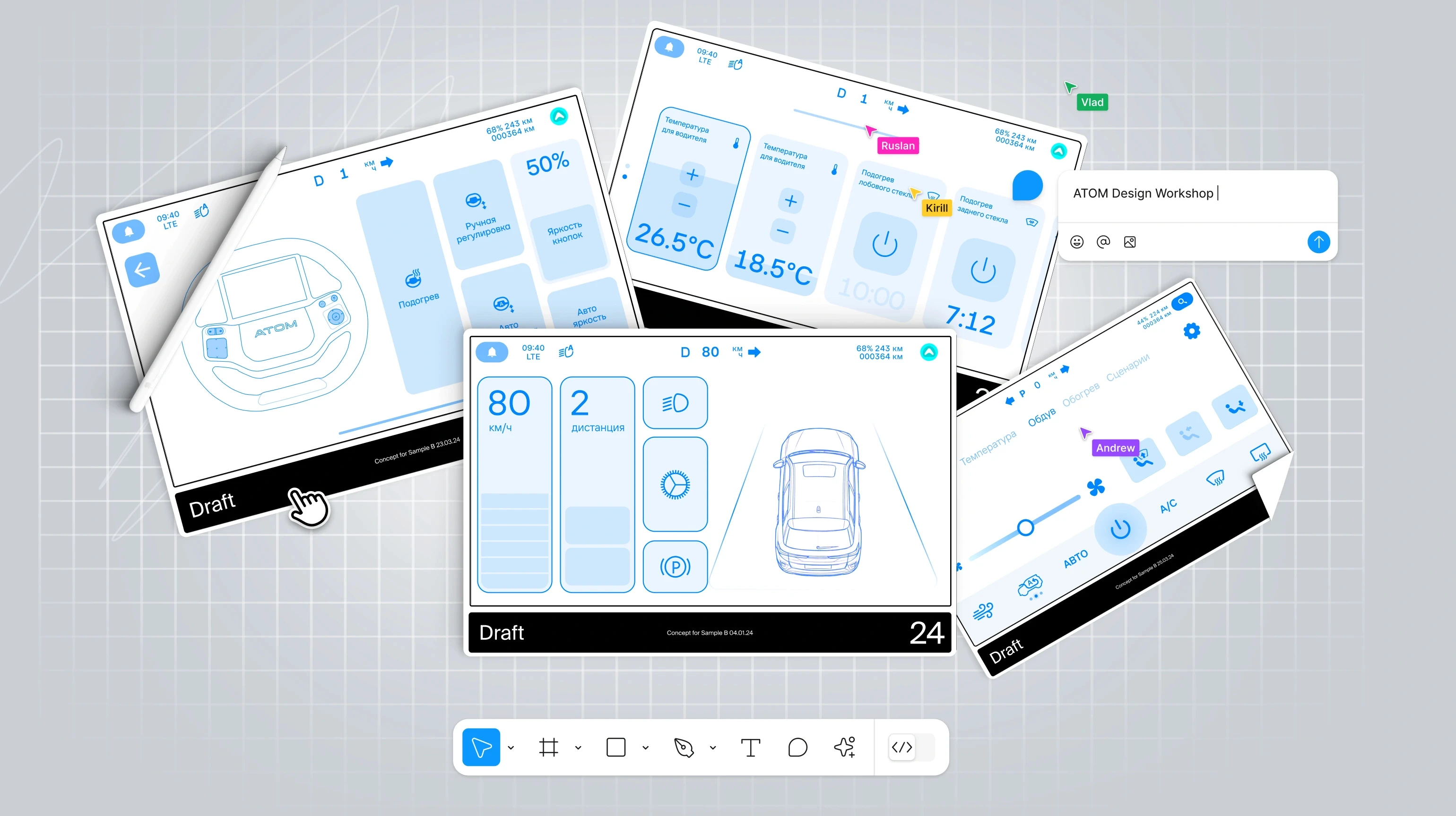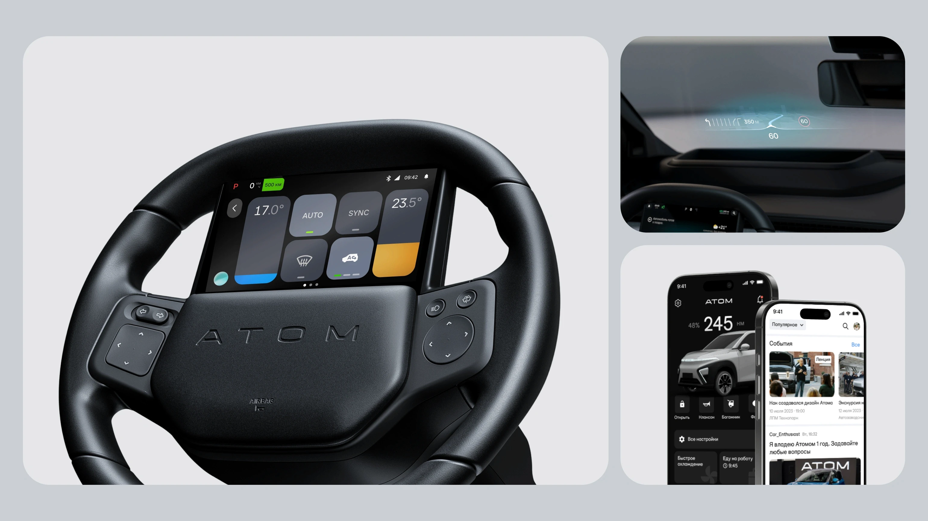 ATOM is a next-generation electric vehicle designed as a «gadget» with extensive personalization and digital city interaction. Unlike traditional cars, ATOM is built around its own operating system, requiring a completely new approach to automotive interfaces. My team and I worked on the core digital components, including the Steering Wheel Panel (SWP), Head-Up Display (HUD), and the mobile app ecosystem.