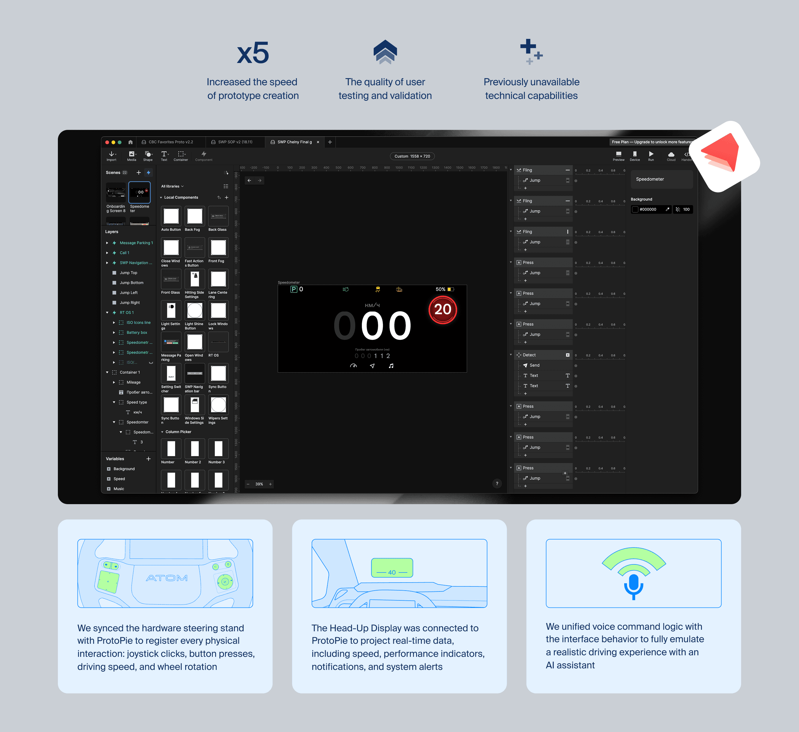 Because Figma couldn't handle the complexity of car interfaces and hardware synchronization, we integrated ProtoPie into our workflow. This increased our prototyping speed fivefold. We tested our designs on a series of evolving hardware stands — from simple gaming wheel setups to the advanced «BEREZKA» stand that mimics a real car environment with moving seats and mirrors.
