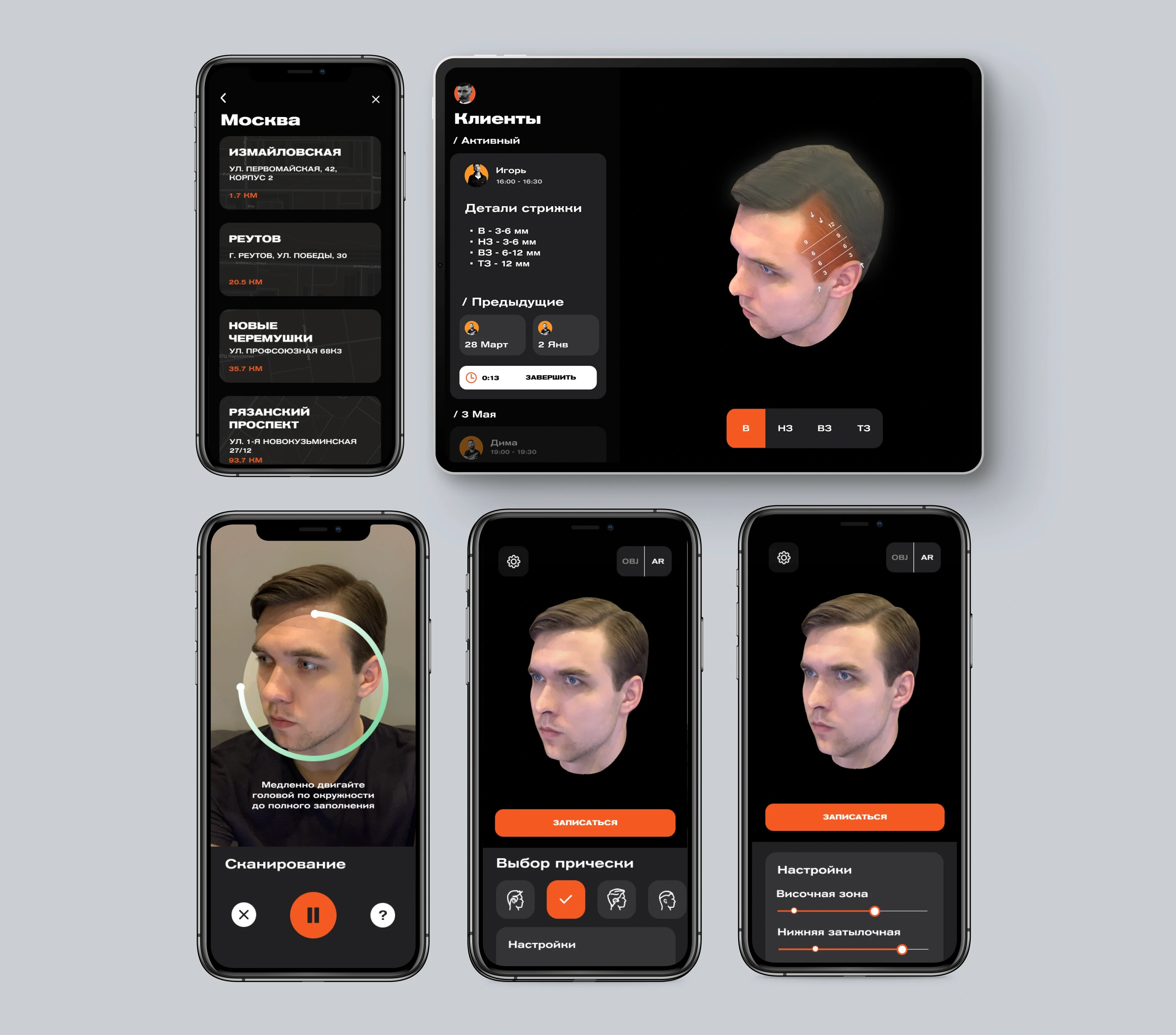 I designed a specialized interface that allows men to scan their head and virtually test different hairstyles. The process includes a guided 3D-scanning flow where the user moves their phone around their face to create a realistic digital model. Once scanned, users can adjust parameters like hair length and fade levels. The final look is saved and synced with the booking system, providing the barber with a precise visual reference before the client even arrives at the salon.