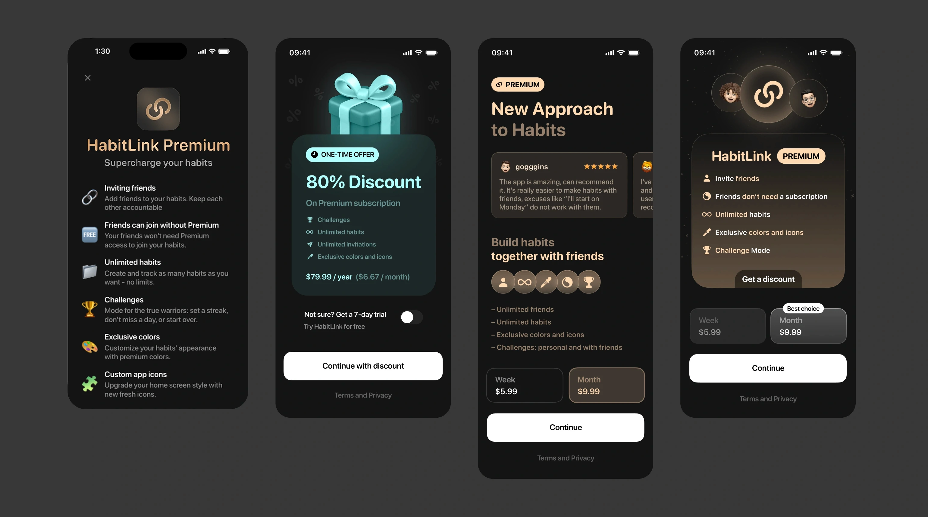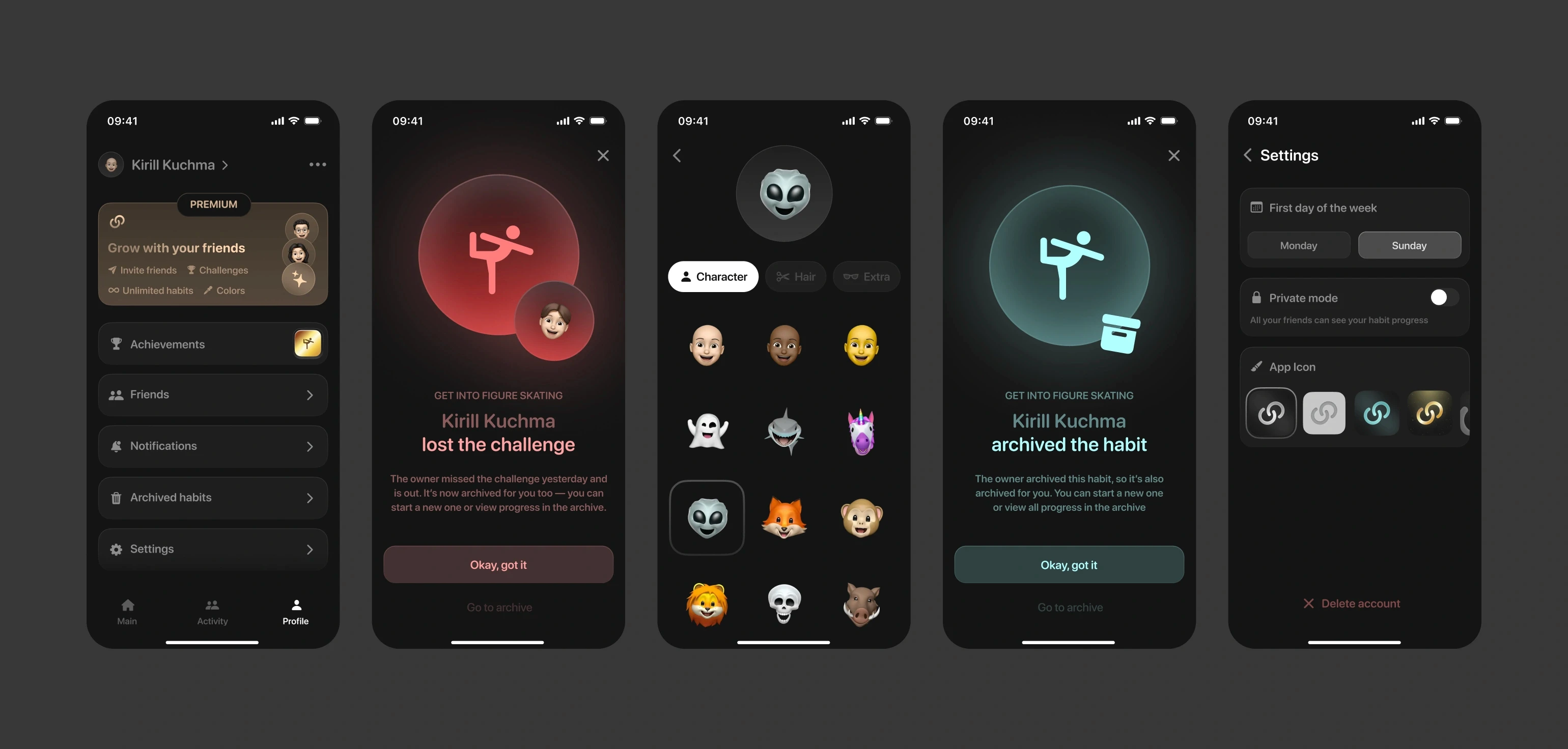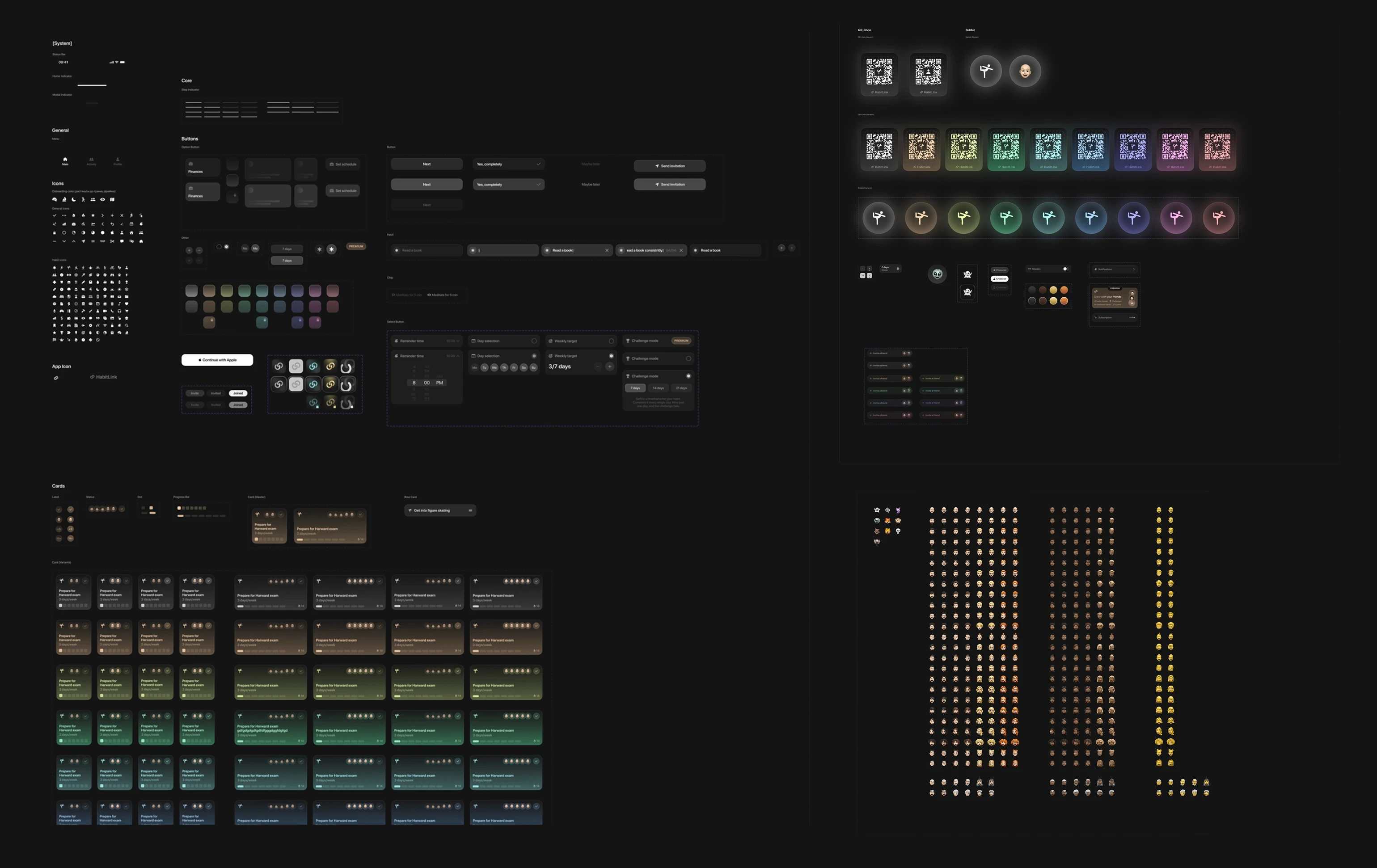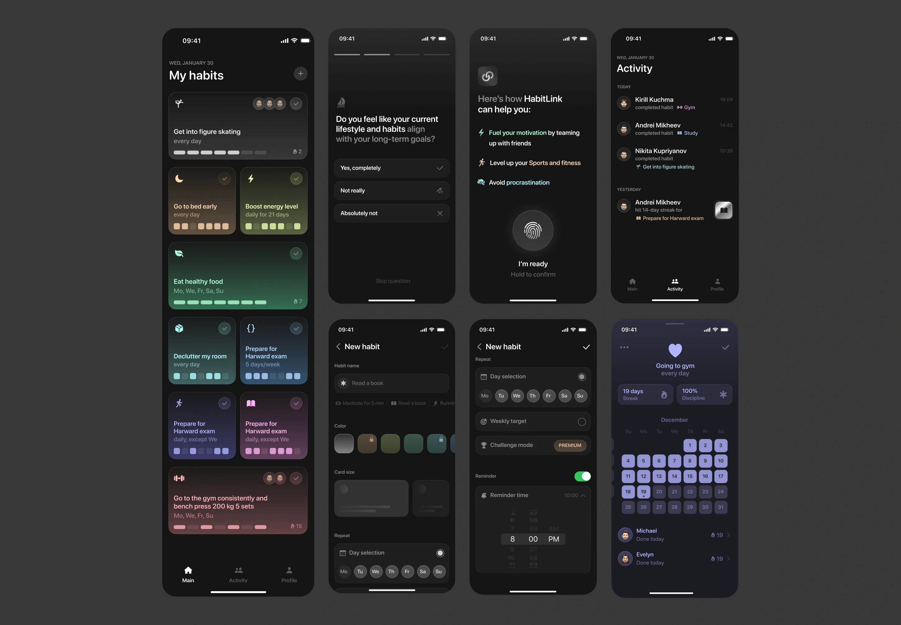 The first stage involved a deep dive into social dynamics within productivity tools. I designed a minimalist, high-contrast dark interface that reduces friction and highlights user progress. Central to this phase was the development of a universal UI-Kit. I implemented a flexible architectural approach that allows for full color customization across all components; users can personalize their habit cards with a wide spectrum of gradients and tones, ensuring that the interface scales beautifully regardless of the chosen theme.