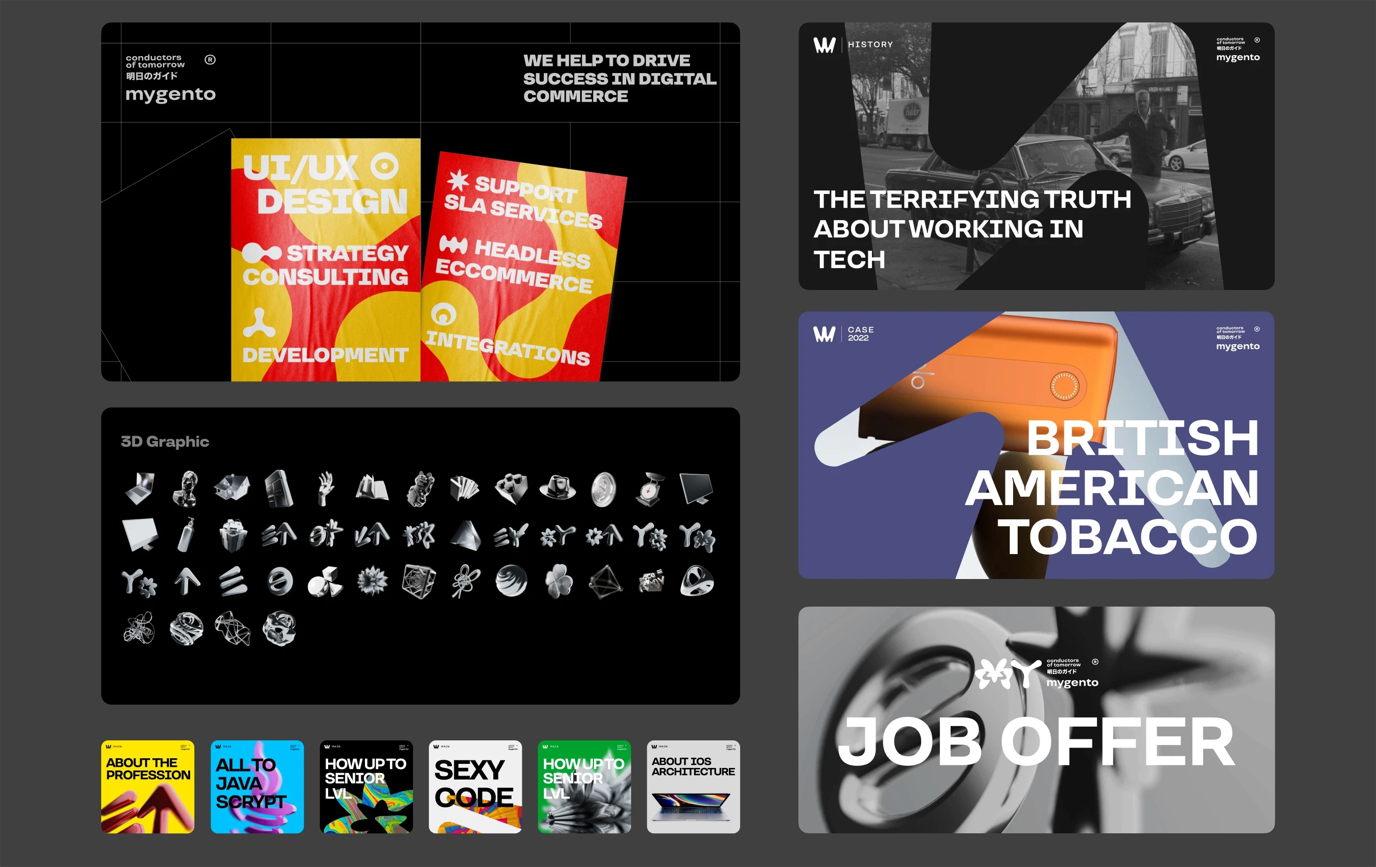 Mygento is a leading e-commerce solutions provider and a certified Magento (Adobe Commerce) partner. The agency combines digital strategy, high-end development, and user experience design to deliver complex B2B and B2C solutions for global brands. My task was to elevate the agency’s visual communication by creating a cohesive language across their website, social media, and internal portals.