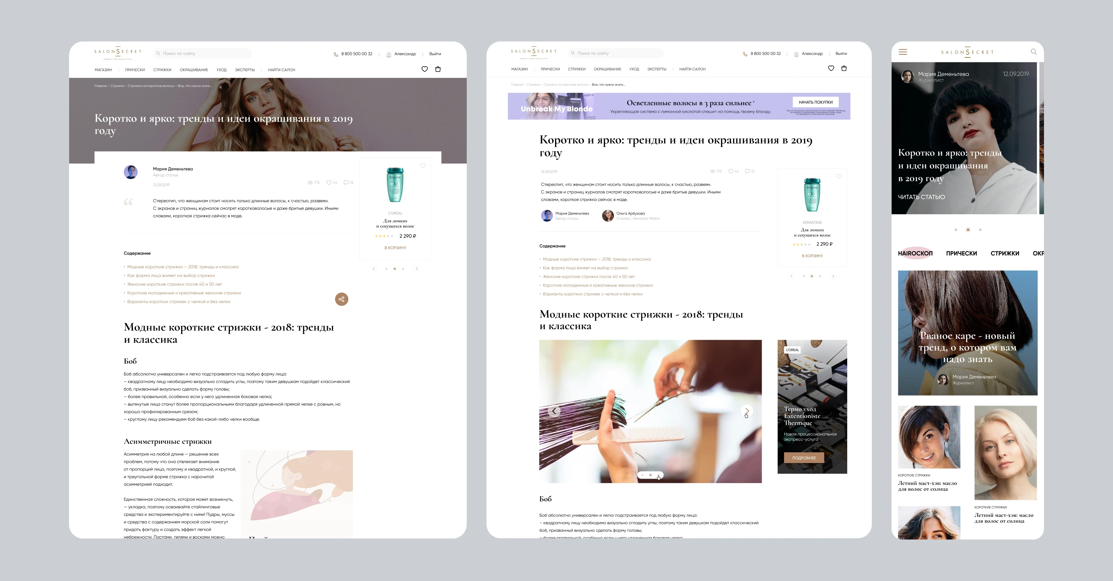 To establish brand authority, I designed a modular editorial hub. This «Beauty Guide» allows professional masters to share trends and advice. I created a flexible set of templates for various content types — from step-by-step guides to reviews — ensuring an engaging reading experience across all devices.